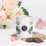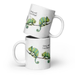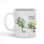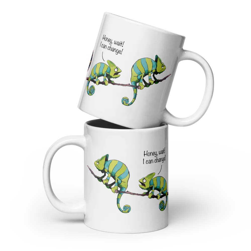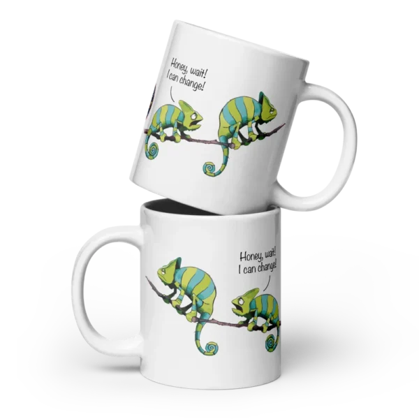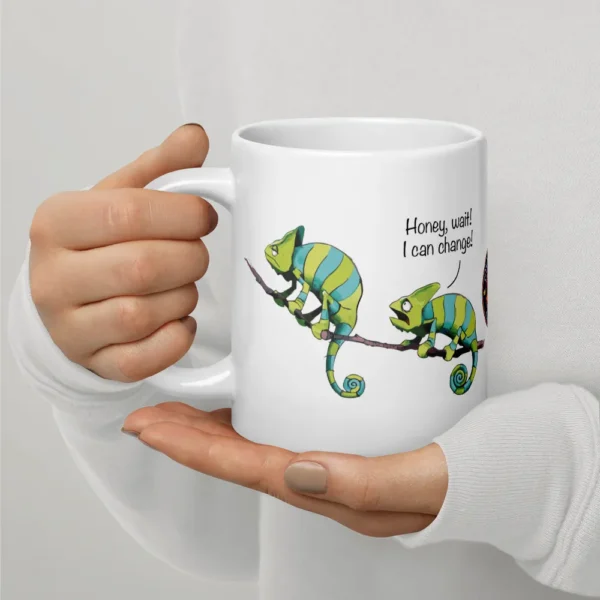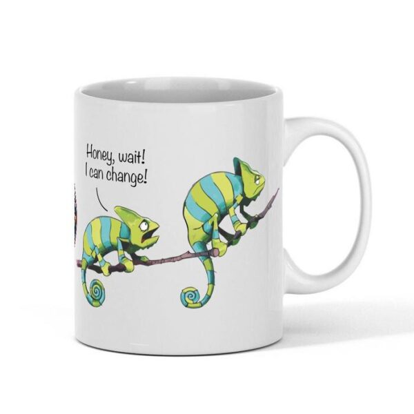 Get your hands on this exclusive mug, perfect for every chameleon lover! Featuring a hilarious design of a chameleon couple having a fight with the phrase: “Honey, I can change”.